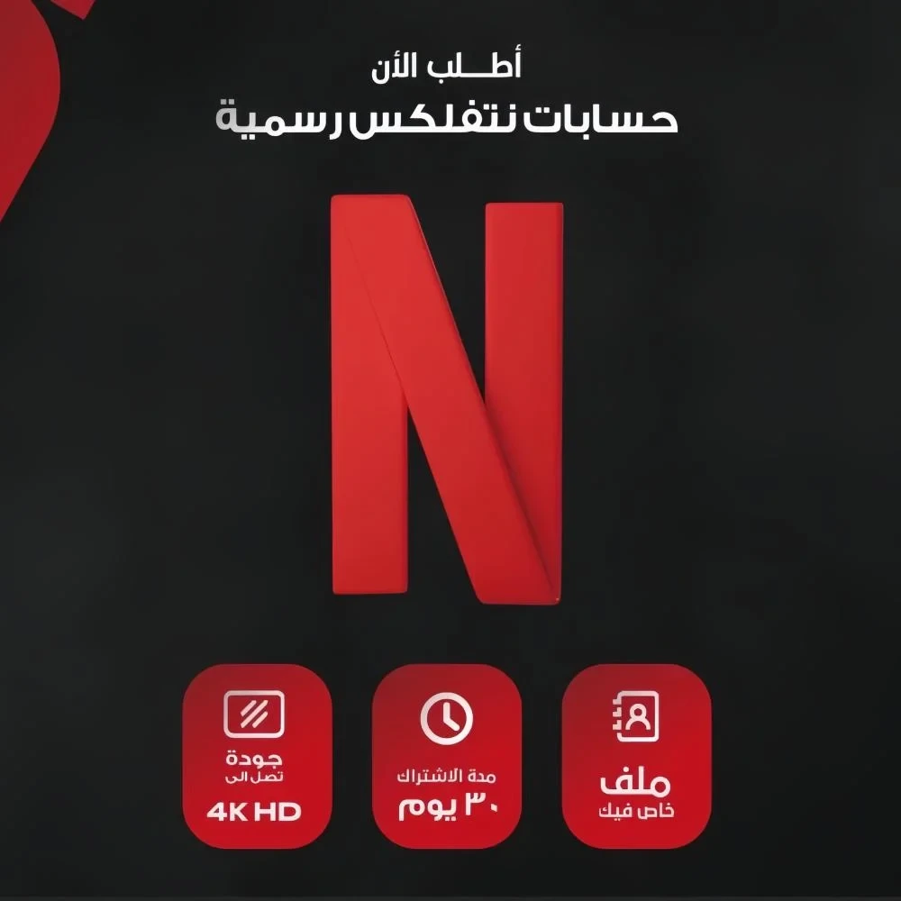 نقدم لكم اشتراك نتفلكس لمشاهده مسلسلات نتفلكس وجميع الافلام مع ضمان كامل مدة الاشتراك ويعمل على تطبيق نتفلكس وجميع الأجهزة الداعمه